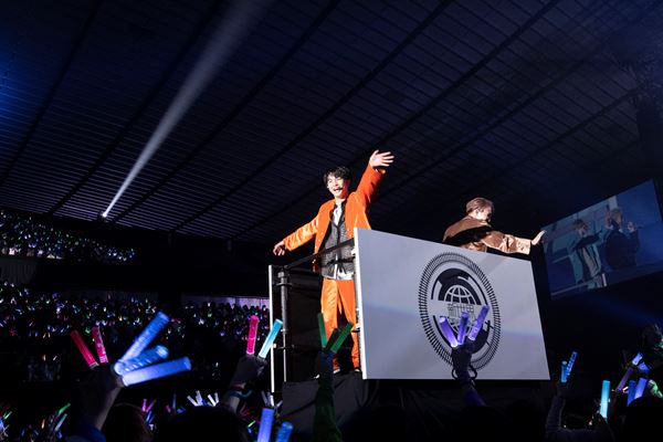 続く『Star Gear』。正面だけではなく、サイドにも体を向けてパフォーマンスを披露。全ての8号車を楽しませようという気持ちが伝わってくる。ステージ上で上がる炎をバックに『Cead Mile Failte』では落ち着いた照明の中でクールな演出を見せる。ボーカル2人が背中合わせで始まる『Feel the light』。打って変わって、シンプルな演出の中で、ダンサー陣のパフォーマンスが世界観の輪郭を濃くしていく。タカシの透明感、シューヤの甘い声、ボーカル2人の歌声の相性の良さが分かる楽曲でもある。