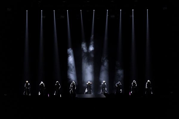 会場が暗転し、色とりどりのペンライトが煌めく。スクリーンには広大な大地を映すモノクロの映像。9本のラインがやがてレールとなる。黒のローブに身を包んだメンバーの姿が次々と映し出され、その映像の中の衣装そのままの9人がステージに現れる。