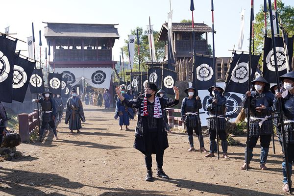 さらに、信長が幼少期を過ごし、濃姫を迎え入れた城である那古野城や、標高329メートルの金華山に築かれた城である岐阜城の一部を大規模オープンセットで作成。那古野城はその規模感も驚愕だが、それに合わせて数百人の出演者が結集、スケール感あふれる映像が撮影された。岐阜城は立地の険しさを表現するため、岩壁に囲まれた斜面を使って、岐阜城の一部を建てた美術部の渾身作で、岩肌を流れる滝をそのまま活用するなど、そこにある自然を最大限に活かしたセットとなっている。
