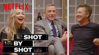 公開された映像では、友人たちに大富豪マイルズ(エドワード・ノートン)が謎解きゲームの説明をしている物語序盤の映像が映し出され、ダニエル、エドワード、ケイトの3人が撮影当時のエピソードを振り返る。豪華な大広間でテーブルを囲む参加者たちに「もし犯人が分かったらその殺人法を教えてくれ。何よりも重要なのは動機だ」と呼びかけるマイルズに対し、食い気味みに謎解きの答えを披露し、ゲームの腰を折るブラン。