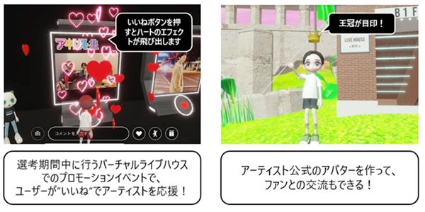 ※ユーザーがアーティストに対する好きや応援を示すもの。バーチャル空間内に設置されるアーティストパネルのいいねボタンをユーザーが押すと、ハートのエフェクトが飛び出します。