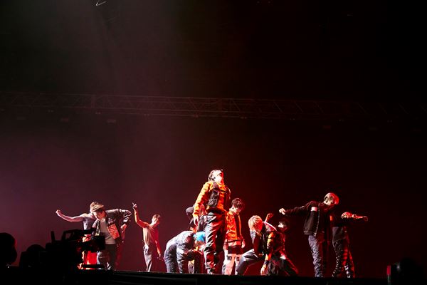 洗練されたイントロが流れ出すと、1曲目に始まったのは「Born To Be Wild」。河野純喜のパワフルで突き抜けるようなボーカルから勢いよく幕を開け、グループのライブでも盛り上がるこの楽曲で会場の温度を一気にヒートアップさせたまま、間髪を入れず「Rose」を歌唱。薔薇の花のように真っ赤に染まった鋭いライトの中、一糸乱れぬシンクロダンスが美しくしなやかに浮かび上がった。ベースシンセが特徴の重低音がアリーナに響き渡り、今回のフェスにふさわしい選曲となった。