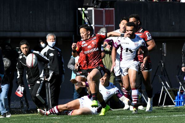 後半開始早々にはクルーデンの突破からパスを受けたCTB中野将伍がインゴールにボールを運ぶと、49分には相手ボールスクラムを押し込み、こぼれたボールを獲得、松島が80m近くを爆走して見せた。その後もモールにCTBに入った森谷圭介がグラバーキックでNo8テビタ・タタフを走らせるなど、攻め手を緩めず。最後は“持っている”河瀬がデビュー3戦連続トライを決めてノーサイド。D1で旋風を起こしていた相模原DBに51-13と洗礼を浴びせた。