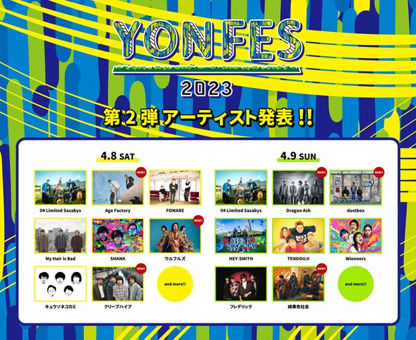 4月8日(土)・9日(日) に愛知・モリコロパーク(愛・地球博記念公園)で開催される、04 Limited Sazabys主催の野外フェス『YON FES 2023』の第2弾出演アーティストが発表された。
