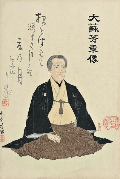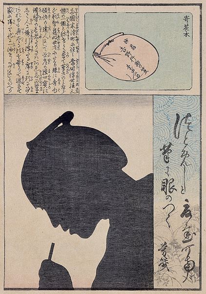 落合芳幾は、師・国芳の死絵(歌舞伎役者や戯作者、絵師などが亡くなった時に、辞世の句や法名、没年などを記した似顔絵)を描いた、国芳門下の一番弟子。17-18歳の時に歌川派に入門し、幕末には安政の大地震を描いた錦絵で名声を得た。しかし明治時代以降は浮世絵に見切りをつけ、『東京日日新聞』よりゴシップ的な記事を取り上げた新聞錦絵を始めて絶大な人気を博した。