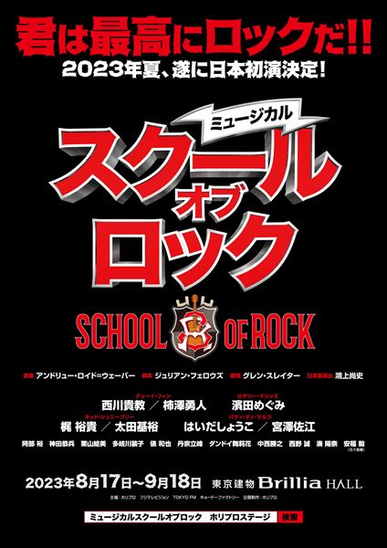 本公演は、売れないロッカーが名門進学校の臨時教師になりすまし、生徒たちにバンドを組ませるコメディ映画として2003年に公開された『スクールオブロック』のミュージカル化作品。2015年にアンドリュー・ロイド=ウェバーのプロデュース・音楽によってブロードウェイで初演された。日本版では鴻上尚史が演出を手がけ、ロックを愛する破天荒な熱血バンドマンのデューイ・フィン役を西川貴教と柿澤勇人がWキャストで演じる。