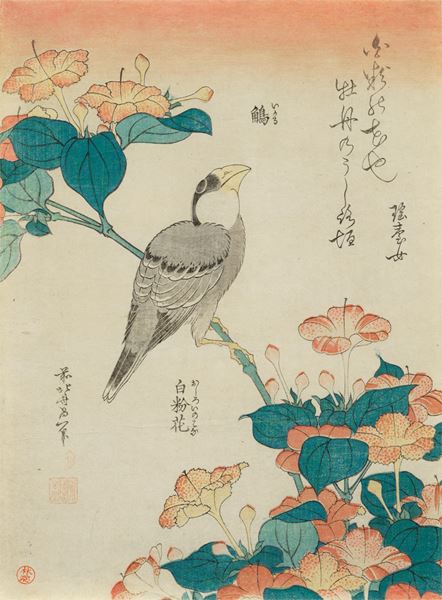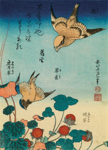 もちろん鳥や花を画題とする花鳥画も数多く残しており、なかでも天保5(1834)年頃に西村屋から出版された中判花鳥画シリーズは、北斎の花鳥図として知られている。《鵙 翠雀 虎耳草 蛇苺》、《文鳥 辛夷花》など、花と鳥を組み合わせたデザインに、漢詩や俳諧が添えられた、