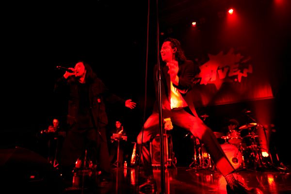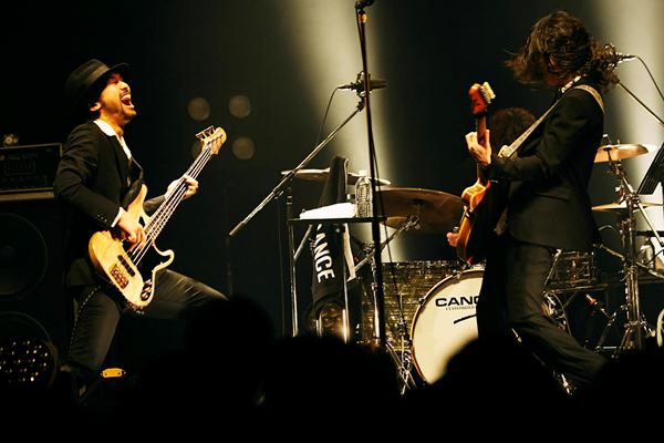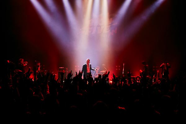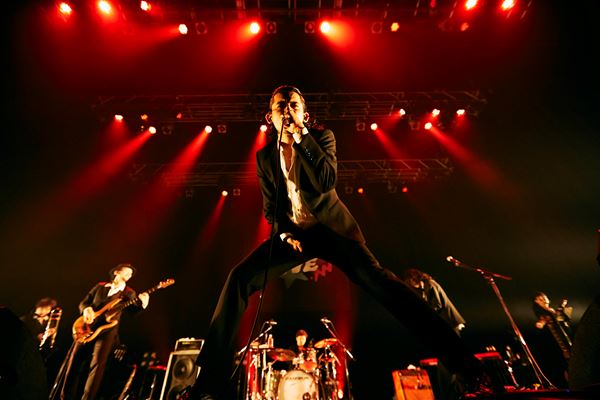濃赤の照明がステージを染めるなか「仁義なき戦いのテーマ」から「Dance you,Matilda」へ。感情を昂らせるホーンセクション、スリルあるギターの音色が鳴り響く。初っ端から血がたぎるような鬱勃としたエネルギーをぶつけられ、観客のテンションが一気に高揚していくのがはっきりと伝わってくる。「ALI、始めます!」、LEOが声を張り上げて突入すると、途端にフロアからワッと歓声が湧きたつ。この日の公演はマスク着用であれば声出しが解禁されていることもあって、観客は瞬間々々の感情を拍手に、歓声に換え、メンバーへ思いを届ける。