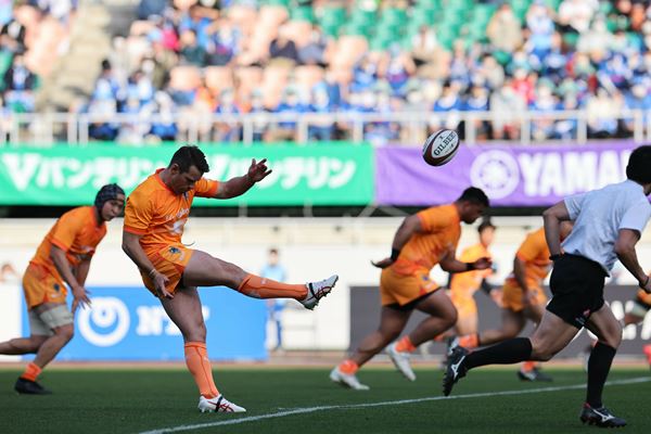 12月25日・昭和電工ドーム大分でのゲームは意外な幕切れとなった。主導権を握ったのは横浜Eだった。5分、CTBジェシー・クリエルのラインブレイクからパスを受けたWTBイノケ・ブルアが右サイドを疾走し、先制トライ。SO田村優が難しい角度のゴールを通して7-0。13分横浜EがPGで加点すると、25分にはS東京ベイのSOバーナード・フォーリーがPGを決めて10-3。39分には敵陣深くでスクラムを得たS東京ベイがSH藤原忍、フォーリー、WTB木田晴斗と素早くつないでトライ。シビアな角度のGは決まらず、横浜Eの10-8で前半を折り返した。
