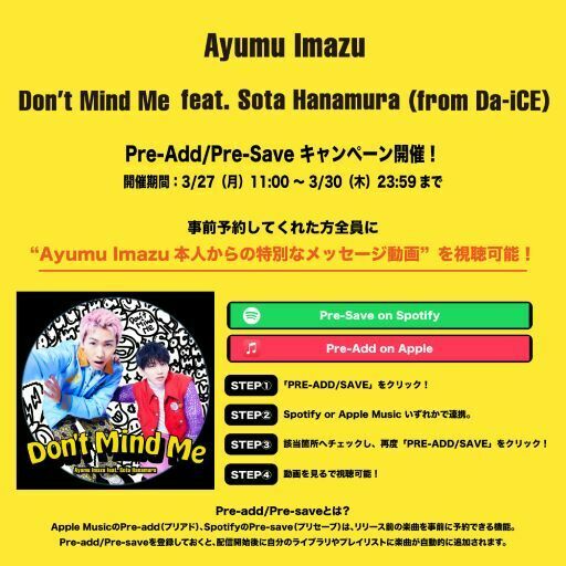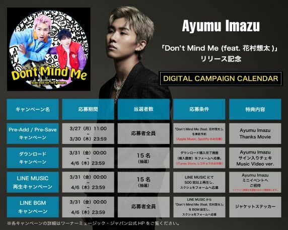 併せて、「Don't Mind Me(feat. 花村想太 from Da-iCE)」のために撮り下ろされたアーティスト写真、配信ジャケットも公開された。さらに本日3月27日より音楽配信サービスApple Music/SpotifyにてPre-Add/Pre-Saveキャンペーンも開始。キャンペーンに登録したユーザーは、Ayumu Imazu本人からの特別なメッセージ動画を見ることが出来る。