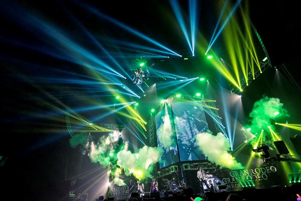 ステージに目をやると、バンドセットのはるか頭上には牛骨と“GR”の電飾が飾られ、その下にはライブロゴが光る2面の巨大なLEDビジョンが存在感を放つ。開演の17時を回るやいなや会場が暗転すると、「うわっ……!」という声が沸き上がる。アコースティックギターの軽快な響きにのせたe-ZUKAの伸びやかなギターソロが聴こえ、暗いビジョンに映し出されたのは、夜の遊園地をきらめきながら縦横無尽に疾走するジェットコースターのレール。