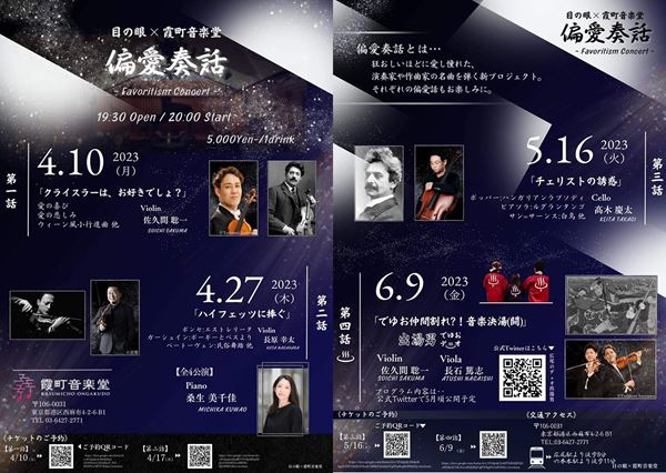 4回シリーズの各回において、演奏者が“偏愛”する作品、作曲家、楽器にフィーチャー。それぞれの溢れ出る愛を音楽とトークで届けるという1時間の濃密なプログラムはとても魅力的だ。しかもドリンクを飲みながら楽しめるのは、バーコーナー併設の霞町音楽堂ならでは。上質なクラシック音楽と美味しいお酒でくつろぐひとときを楽しみたい。