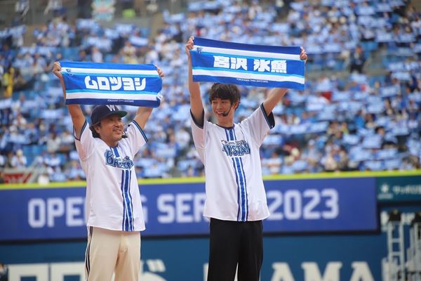 WOWOW『ドラフトキング』出演のムロツヨシ&宮沢氷魚がセレモニアルピッチに登場