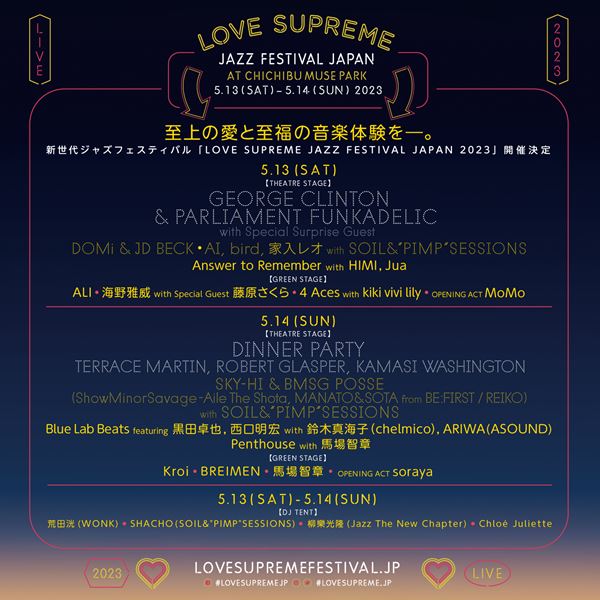 すべて見る5月13日(土)・14日(日) に埼玉・秩父ミューズパークで開催される『LOVE SUPREME JAZZ FESTIVAL JAPAN 2023』の全ラインナップが発表された。
