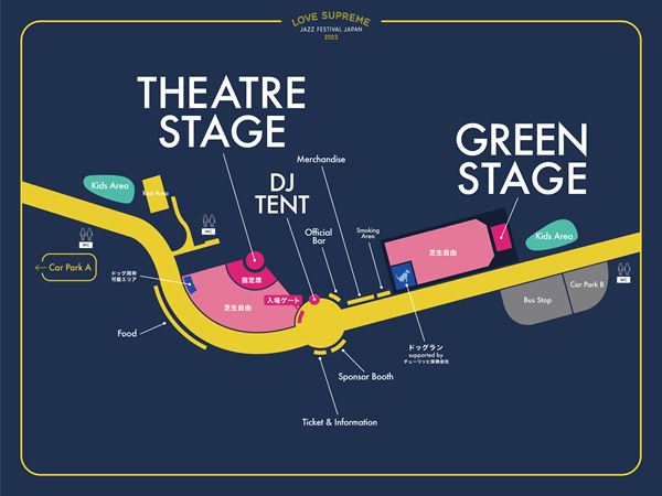 併せて会場マップが公開された。今回は「GREEN STAGE」後方に「ドッグラン supported byチューリッヒ保険会社」を設置。こちらのエリアはイベントのチケットを持っていない人も犬同伴であれば入場することができる。また「THEATRE STAGE」の芝生自由にも一部犬とイベントを鑑賞できるエリアが設けられる。