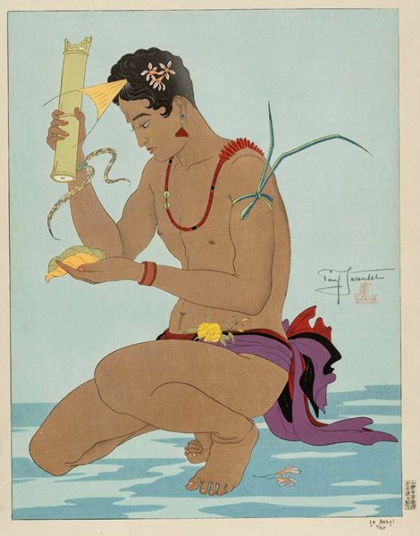 新版画といえば川瀬巴水や吉田博などの風景画が有名だが、ジャクレーが描いたのは、サイパン島やヤップ島といった南洋のミクロネシアの島民たち。昭和初期、30代前半だったジャクレーは、日本の委任統治領だった南洋の島々に何度も長期滞在し、島民たちと親交を深めながら、数多くの水彩画を描き、それを新版画の制作へとつなげていった。