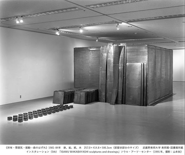 武蔵野美術大学で教鞭を執っていた1981年、若林は学内にある工房に鉄板を立て、自分自身のために10畳ほどの空間を制作。その後、この通称「鉄の部屋」の周囲を鉛で覆い、周辺に植物や大気を表す鉛の板やキューブを配置し、《所有・雰囲気・振動―森のはずれ》(1981-84年)として発表している。同展では、この作品を約30年ぶりに展示する。