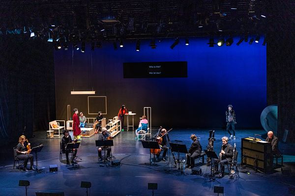 クラングフォルム・ウィーンによる多様な奏法の演奏が粒立っていて、そこはかとなく不穏な「気配」が空間を支配する舞台だ。演劇と音楽が従属的な関係にならず、対等である音楽劇の創造を目指したという本作。つまり、音楽は俳優の演技を補ったり感情を増幅させるためにあるのではなく、俳優のせりふや動作も、音楽の内容を説明するためにあるのではない。岡田のテキスト作成と藤倉の作曲も同時進行で、互いを必要以上に憚ることなく進められたという。舞台での演奏と後方での演劇、ともに独立した両者が、「気配」という不気味な概念でつながっているのを強く感じた。