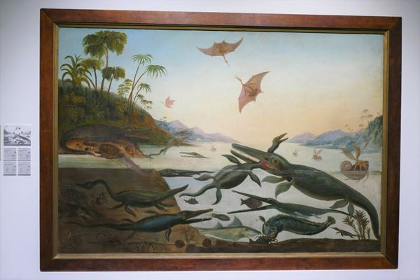 展示の冒頭を飾るのは、19世紀の恐竜“発見”から間もない時期に描かれた、パレオアート黎明期の作品群。地質学者ヘンリー・デ・ラ・ビーチの原画による《ドゥリア・アンティクィオル(太古のドーセット)》は、イギリスの女性化石採集者、メアリー・アニングの功績をたたえるために制作された版画で、古生物の生態を復元した史上初の絵画のひとつ。魚竜イクチオサウルスが首長竜プレシオサウルスを捕食している様子が描かれている。