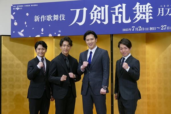 すべて見る刀剣に宿る付喪神が戦士の姿となった“刀剣男士”が活躍する育成シミュレーションゲーム『刀剣乱舞 ONLINE』を原案にした新作歌舞伎『刀剣乱舞 月刀剣縁桐(つきのつるぎえにしのきりのは)』の製作発表記者会見が6月5日、都内で行われ、歌舞伎俳優の尾上松也(三日月宗近)、尾上右近(足利義輝 / 小狐丸)、中村鷹之資(松永久直 / 同田貫正国)、中村莟玉(義輝妹紅梅姫 / 髭切)が出席した。