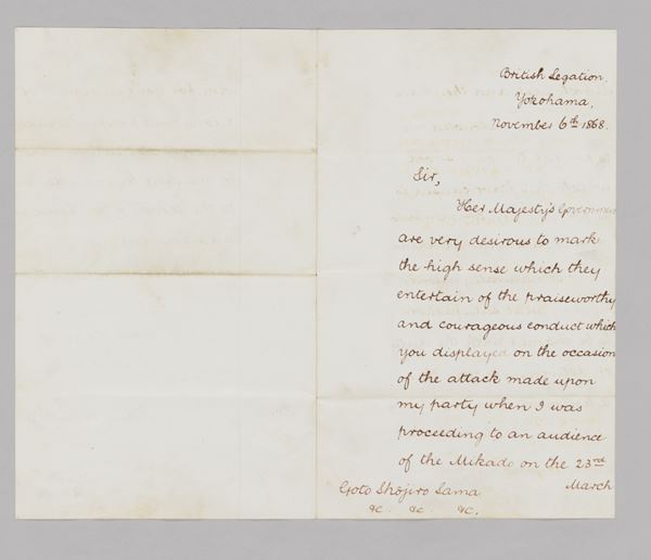そんな中、同展で特別に注目されるのが、明治の元勲・後藤象二郎が英国ヴィクトリア女王女王より拝領したサーベルの初公開である。長らく行方不明となり、近年、世田谷の静嘉堂で発見されたこのサーベルは、1863年3月、京都で明治天皇に謁見しようとした英国公使ハリー・パークスが、ふたりの攘夷派志士に襲撃された「パークス襲撃事件」の際に、果敢に奮戦しパークスを護った感謝のしるしとして、当時土佐藩士だった後藤象二郎に贈られた。静嘉堂文庫の創設者・岩崎彌之助の妻・早苗が後藤の長女であったことから、岩崎家に継承されたと考えられる。明治維新、近代日英外交史上、歴史の転換期の資料として、極めて貴重な遺品といえるだろう。