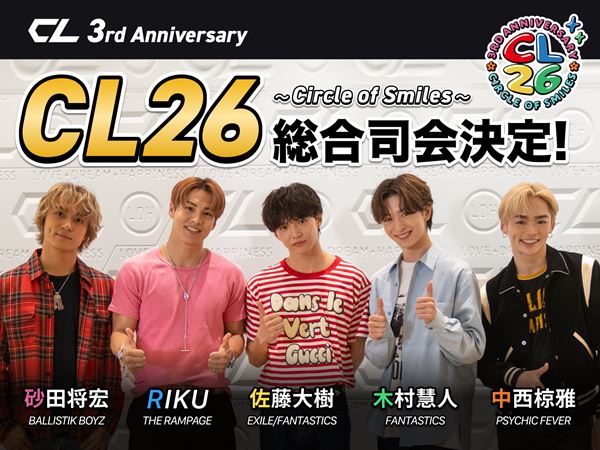 LDHによるデジタルコミュニケーションサービス「CL」の3周年を記念した26時間生配信『CL 3rd Anniversary CL26〜Circle of Smiles〜』が、8月11日(金・祝) 18時から12日(土) 20時まで実施されることが決定した。