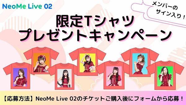 『NeoMe Live 02』のチケットを購入いただいた方の中から抽選で、サイン入りのメンバーTシャツを各1名様にプレゼント。Tシャツは販売予定のデジタルグッズと同じデザイン。さらに、応募者の中から1名様に全員のサインが入ったグループTシャツが当たるダブルチャンス。