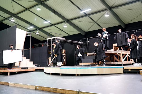 話を稽古場に戻そう。陽が傾きだした頃、2幕のブロック通し稽古が始まった。ブロック通しというのは、これまでの稽古で場面ごとに細かく作り上げてきたものを、数シーン分繋げてみる、という稽古だ。演出の伊藤今人が前に立ち、各キャストの動きの流れを確認しながらシーンを作り上げていく。高さのある可動式のセットで場面の切り替えや立場の違いを表し、息をつく間もなくシームレスに物語を進行させる演出は、様々なジャンルの舞台芸術で縦横無尽に活躍してきた伊藤今人の腕の見せ所だ。