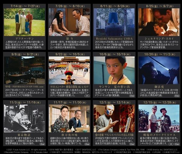 再開催ではこれまでのラインナップに加え、同館のシアター音響監修を務めた坂本が音楽を担当した新旧の映画作品や自身のドキュメンタリー映画、さらに彼が同館の館内楽曲を制作中に「#観たいもの」とメモしていた作品を追加。また、「フィルム上映できる劇場をぜひつくって欲しい」という坂本の意志のもと作られた同館だからこそできる、35mmフィルムでの上映作品も用意されている。
