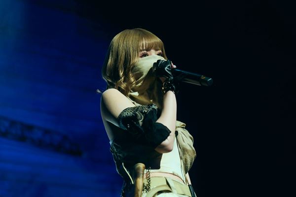 幕が落ちると、サバイバル風な衣装の本人がお目見え。ショートバージョンで歌い終わるや、「ice blink」の扇動的なビートとサンプリングボイスに乗って、10人の女性ダンサー=戦慄ビッチーズが入ってくる。そのセンターでクールに踊り、刺すように歌う戦慄。ステージにはスモークが噴き上がり、レーザーも飛び交った。