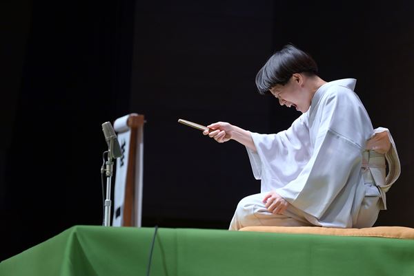 口演したのは、道に迷った男とその道中にあった茶店の老婆のやり取りが可笑しい『幽霊の辻』。はめものによる演出もあり、怪談噺の雰囲気も併せ持つ創作落語だ。老婆が道案内の度に語る不気味な話ももちろんだが、二葉さんが演じる恐怖感を植え付けられた男の描写にたびたび笑いが起こった。