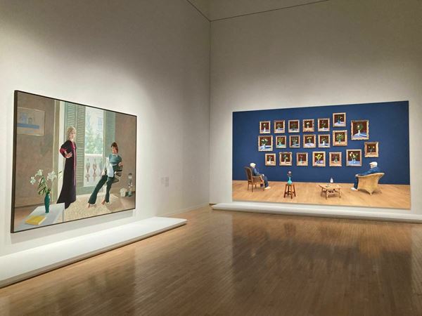 ロンドンで活動していたホックニーは、20代でロサンゼルスへ移住。当時普及し始めたアクリル絵の具を用いた明るい画風で一躍トップアーティストへの座へと駆け上がった。ふたりの人物で画面を構成した「ダブル・ポートレート」は彼の代表的シリーズのひとつ。単なる肖像画の枠を超え、静謐な画面のなかに恋人や家族、親子などの二人が構築した関係性や信頼関係なども描き出すことを試みている。