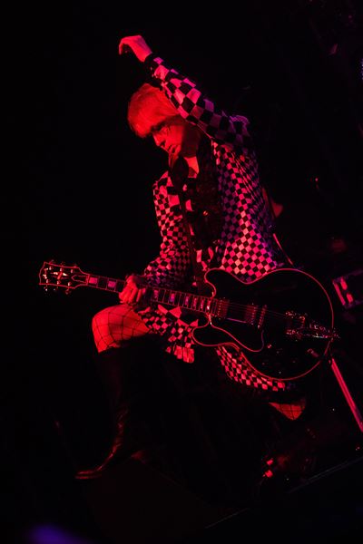 「いつまで続く?死ぬまで続く。いや、死んでも続く。亡霊になってもやってやる」。自分に言い聞かせるような櫻井の語りに、会場からは大歓声が上がり、その勢いのまま「あの娘が待ってる。楽しんでいこうぜ」と「Boogie Woogie」へ。バンド初期の光景や思い出をなぞるロックチューンに、自然とフロアのテンションも上がる。今井が奏でるテルミンのとんがったサウンドや、スクリーンに映るライヴハウスらしき部屋の壁に『殺シノ調べ』や『Six/Nine』など過去のアルバムのジャケットがコラージュされていたのも印象深かった。