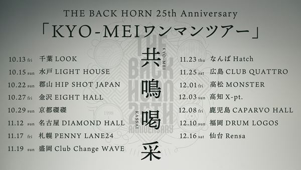 また、10月からスタートする全国15都市15公演の全国ツアー『THE BACK HORN 25th Anniversary「KYO-MEIワンマンツアー」〜共鳴喝采〜』の詳細も発表された。本日7月31日よりファンクラブ「銀河遊牧民」にてチケットの先行抽選受付がスタート。