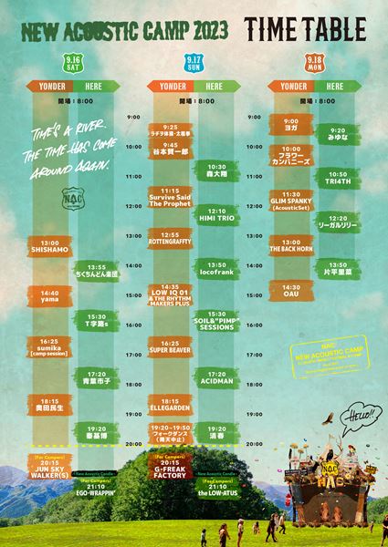 すべて見る9月16日(土) から18日(月・祝) に群馬県利根郡みなかみ町水上高原リゾート200・ゴルフコースで開催される『New Acoustic Camp 2023 〜わらう、うたう、たべる、ねっころがる。〜』のタイムテーブルが発表された。
