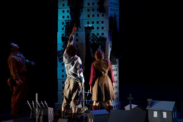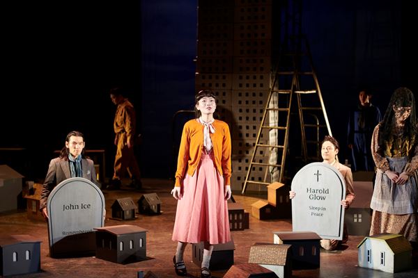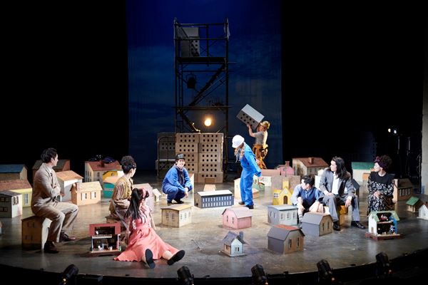 何もない舞台に役者たちが家を運び込むところからはじまり、物語が進むにつれ舞台の上に少しずつ実際にタワーが積み上がっていくのを見ていると、この場所が次にどう変わっていくのかが楽しみになる。街が生まれ、タワーが建つ様子は、何もないところに物語を立ち上げる「演劇」そのものの具現化のようにも見えてくる。やがて、描かれる世界は舞台上だけでなく客席にも広がっていき、観ている自分たちも世界に入り込んだような感覚が強くなっていく。