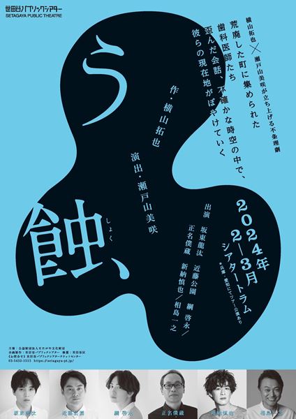 “う蝕”とは医療用語で虫歯のことだそうです。私はてっきりこの作品のための造語かと思っていました。そう勘違いしたまま、“う蝕”という文字を眺めていると、ひらがなの“う”が得体の知れない不穏な生き物のように見えてきて、“う”に人が蝕まれる光景などをこわごわ思い描いたりしましたが、れっきとした医療用語だと知り、筋立てに則した題名だったんだと腑に落ちました。とはいえ、“う”の不穏さはいまだ消えずにいます。『う蝕』、どこか怖い題名です。そして題名にすでに、横山さん&瀬戸山さんの目論見が仕掛けられているわけですから、そこに気づくとまた怖い。どんな舞台になるのでしょう。お楽しみに。