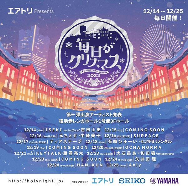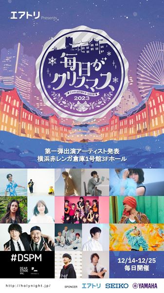 すべて見る毎年恒例のクリスマスイベント『毎日がクリスマス 2023』が、12月14日(木) から25日(月) に横浜赤レンガ倉庫で開催されることが決定。併せて第1弾出演アーティストが発表された。