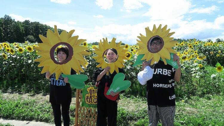 北海道北竜町のひまわり畑を訪れる(左から)水森かおり、友近、おいでやす小田。(c)HBC