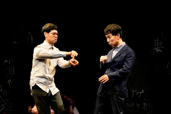 黒い壁で全体が覆われたシンプルな空間。ガレージのようなもののシャッターが唐突に開き、太郎(竜星)が飛び出してくる。その後も数々の人物が舞台上に現れるが、冒頭7~8分は言葉を発することなく、壁や床に、チョークで絵や場所や役名を書き込んでいる。太郎が壁に電球とトイレを描くとそこが太郎のアパートの一室になる、という具合。初演から使われるこの手法は、本作の特色ともなっている。