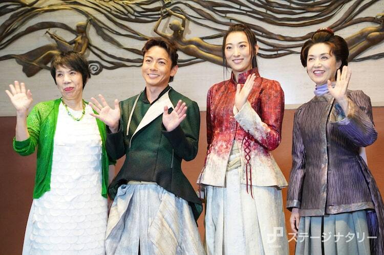 囲み取材には珠城、屋良、剣幸、謝が登壇した。宝塚歌劇団時代から縁がある謝からラブコールを受け、本作へ出演することになった珠城は「先生からお話をいただいたとき、また一緒に作品を作れることがとてもうれしかった。先生はいつも役者1人ひとりに愛情を注いでくださり、ご自身が舞台作りを本当に楽しんでいるのも伝わってくるので、稽古場はいつも明るくカラッとした空気。常々私は、先生は“人間パワースポット”だ、と言っているんです(笑)」と笑顔で話す。