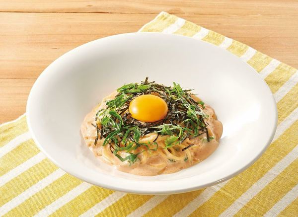 カルボナーラといえば、卵とチーズを使った乳白色の濃厚なソースが特徴。そのカルボナーラに明太子が使われており、和風仕立てになっています。