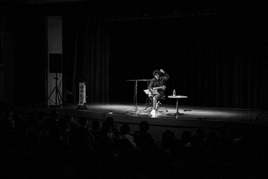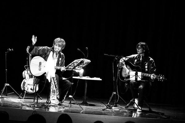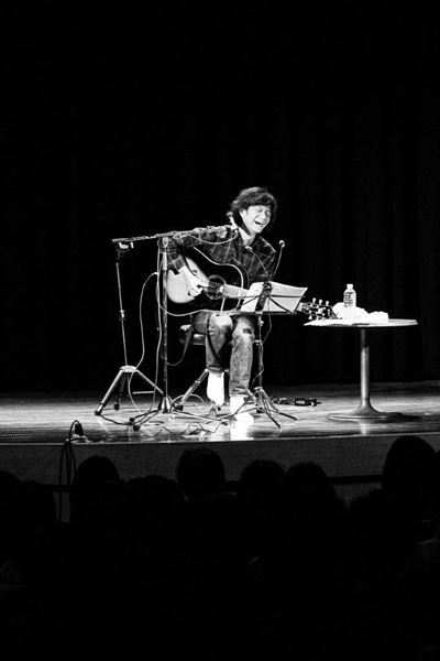 会場となった東洋館は漫才や漫談を中心とした演芸場であり、若かりしビートたけしが芸のイロハを学んだことでも有名だが、そこを弾き語りの場にチョイスしたのは視点の面白さだけではない。傾斜をつけて扇形に設置された客席は見やすく、座り心地もよく、ライヴ感も味わえる絶好のシチュエーション。浅草自体は音楽ファンに馴染みの薄い場所ではあるが満員御礼となっていた。