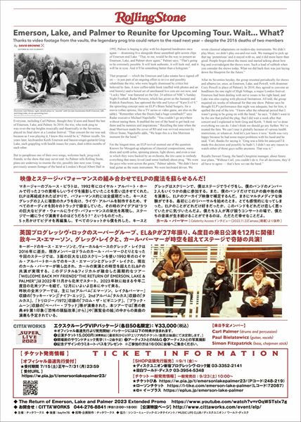 本公演では、3面の巨大なLEDスクリーンを使い1992年のロイヤル・アルバートホールでのキースとグレッグ、そして現在のカールが映し出され、カールの実演との時空を超えたEL&Pの共演が実現する。このデジタル&フィジカルが融合したツアーは『WELCOME BACK MY FRIENDS“THE RETURN OF EMERSON, LAKE & PALMER”』として、2022年11月から北米でスタート。2023年秋に始まる今年2度目の北米ツアーを経て、12月12日(火)・13日(水) に日本にやって来る。