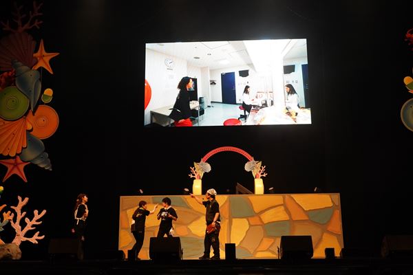 会場に入った瞬間目に入ってきたのは、開演前からステージや会場のあちこちでイベントの準備に追われる“スタッフたち”の姿だ。その様子は、真に迫っており、一瞬、準備途中の会場に入り込んでしまったのだと錯覚するほどの臨場感があった。