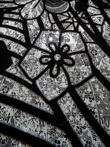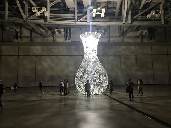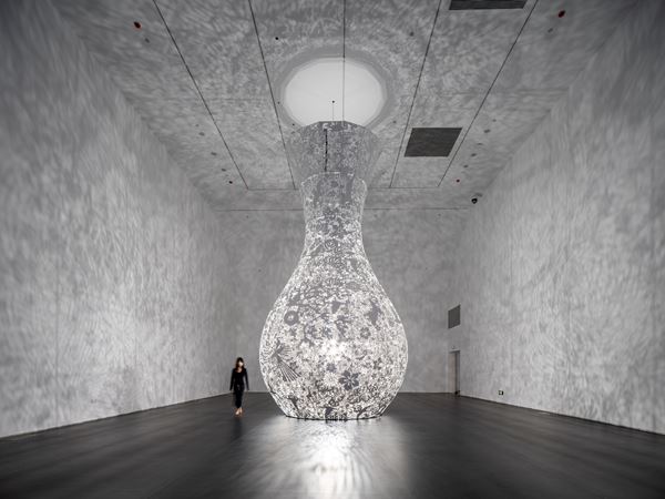 今回の展覧会の大きな見どころのひとつは、この《Gravity and Grace》の最新バージョンが登場すること。様々な動植物からなる繊細かつ濃厚な文様を施された大きな壺から放たれる強烈な光と、それが生み出す影は、核分裂反応の爆発的なエネルギーの象徴とも言える光と原子力が引き起こした未曽有の人災を示唆する。その魅惑的な光と、そこに吸い寄せられる人々の姿を通じて、エネルギーに過度に依存した今日の社会を批評しているのだ。