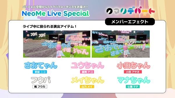 すべて見る11月25日(土) 20時よりバーチャルライブアプリ「NeoMe」にて、バーチャルライブ『NeoMe Live Special ~クマリデパート~』が開催されることが決定した。
