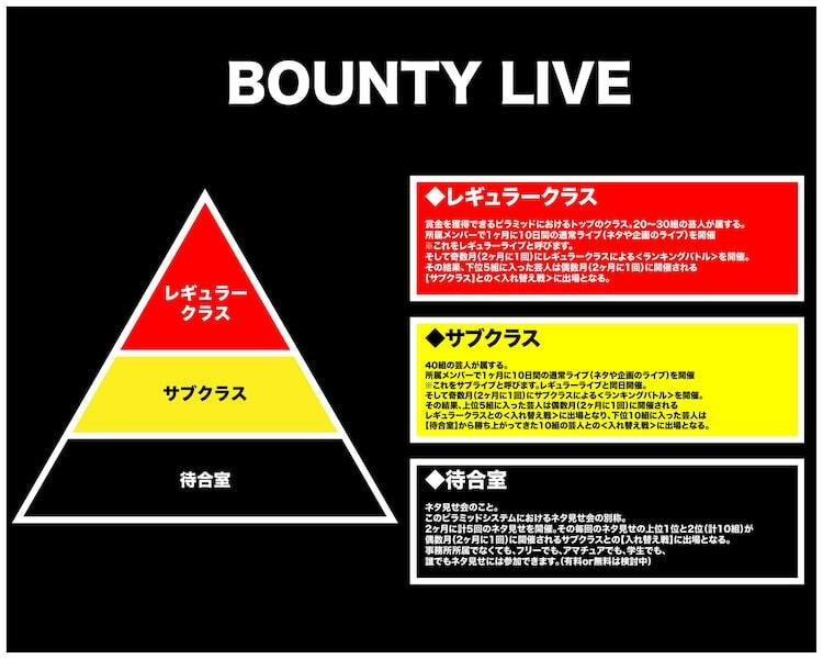 今年2023年にオープンした東京・シアターマーキュリー新宿で、芸歴10年未満の芸人によるピラミッドライブ「BOUNTY LIVE」が始動する。まず11月と12月にピラミッドライブへの参加を希望する芸人全員による“階層振り分け予選ライブ”を開催。BOUNTY LIVEはその結果を受けて2024年1月にスタートする。