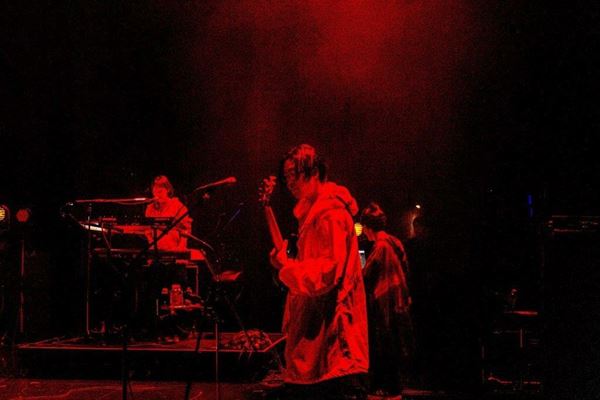 先に登場したのは、妖艶でサイケデリックな音像、転調変調を繰り返す変幻自在なリズムワーク、あるいはファルセットからシャウトまで自由奔放に行き来するボーカル&コーラスが“病みつきになる!”と噂のTempalay。この日はメンバーの小原綾斗(Gt/Vo)、藤本夏樹(Ds)、AAAMYYY(Cho/Syn)に加えて、ODD Foot Worksの榎元駿(Ba)、NIKO NIKO TAN TANのOCHAN(Syn/Gt/Cho)もツアー・サポートとして参加。
