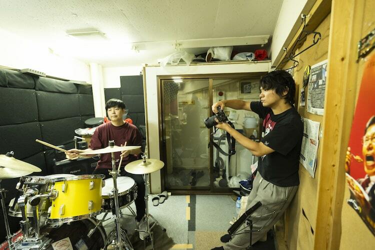 まずは演奏風景から。決して広いとは言えないスタジオには、2台のドラムセットが向き合うような形で置かれている。壁にはいくつかのライブのポスター、部屋のあちこちにメトロノームや音響機材などが雑然と置かれている。「わー! バンドマンの部屋って感じがする!」と竪山はワクワクした表情でスタジオの中に踏み入った。一方、室内の状況を確認して大きな照明機材が組めないことを確認した平岩は、小さめなライトを1つ準備して、まずはこのスペースでどんな写真が撮れそうかを、竪山にアドバイスした。竪山はその一言一句に頷きながら、カメラの設定を変更したり、立ち位置を変えたりしてテスト撮影を始めた。が、いつもに比べると動けるスペースは限られているし、窓のない蛍光灯の部屋では自然光で撮るような面白さが出せない。竪山がなかなかしっくりときていない様子を見て、「部屋の蛍光灯は消せますか?」と平岩が尋ね、部屋の電気が消された。